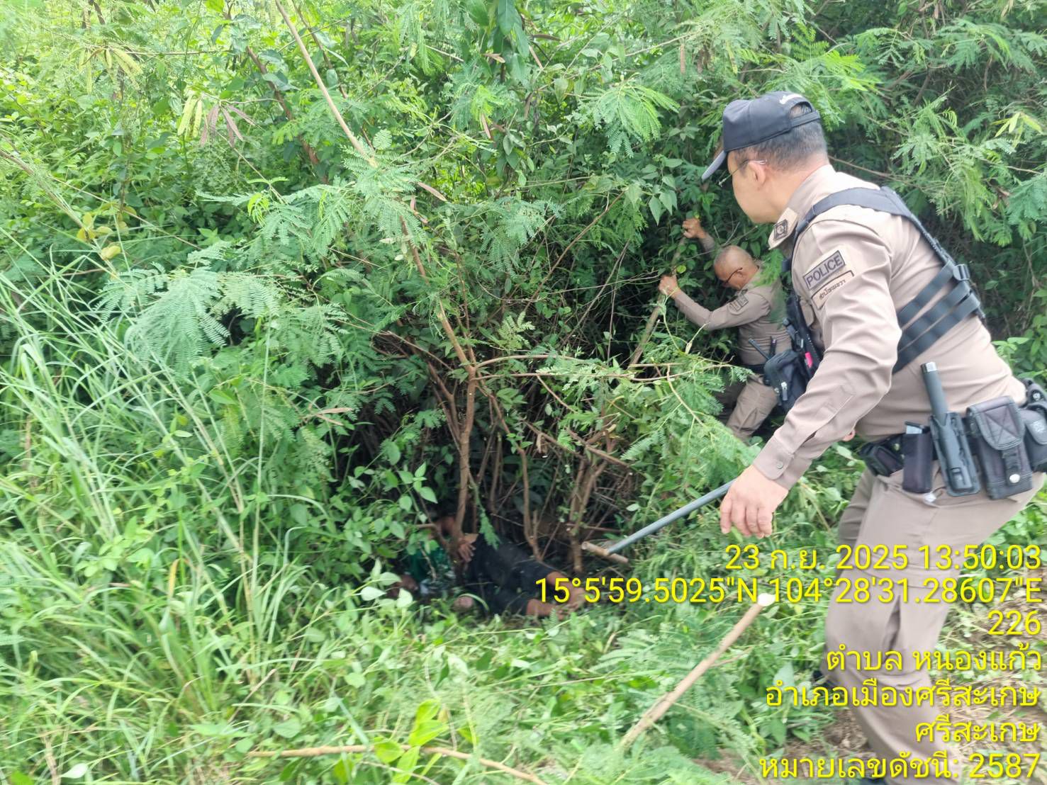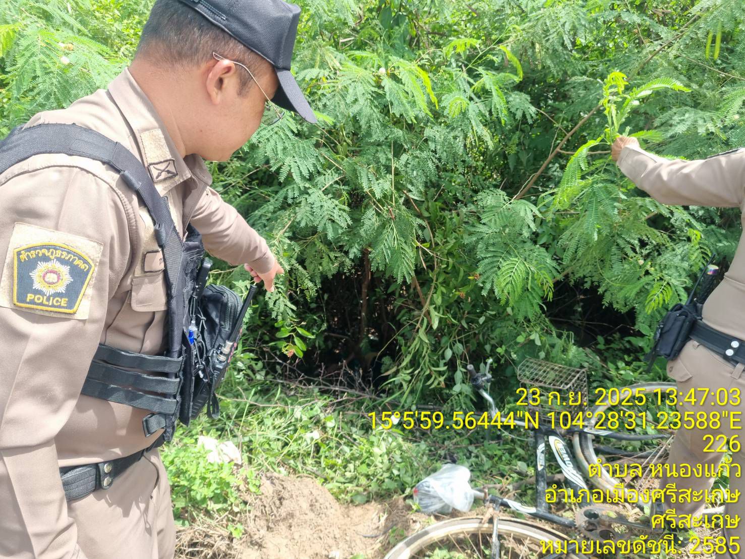 เมื่อเวลา 13.40 น. วันที่ 23 ก.ย. 2568 ร.ต.ต.เศรษฐศักดิ์ ประสาร รอง.สว.(ป.) สภ.โพนเขวา (อ่านว่า โพน-เขวา) ได้รับแจ้งจากพลเมืองดีว่า มีเหตุคนขี่รถจักรยาน 2 ล้อ ล้มกลิ้งตกคลอง และถูกต้นไม้หนีบลำตัวขยับไม่ได้ ที่บริเวณริมถนนทางหลวงหมายเลข 226 สายศรีสะเกษ-อุบลราชธานี ฝั่งขาเข้าเมืองศรีสะเกษ พื้นที่บ้านกะบา ต.โพนเขวา อ.เมือง จ.ศรีสะเกษ จึงรายงานให้ผู้บังคับบัญชาทราบ และรีบเดินทางไปตรวจสอบ พร้อมด้วย ด.ต.กิตติศักดิ์ กำแก้ว ผบ.หมู่(ป.)ฯ และด.ต.ณรงค์กร สุหร่าย ผบ.หมู่(ป.)ฯ รุดไปยังที่เกิดเหตุ