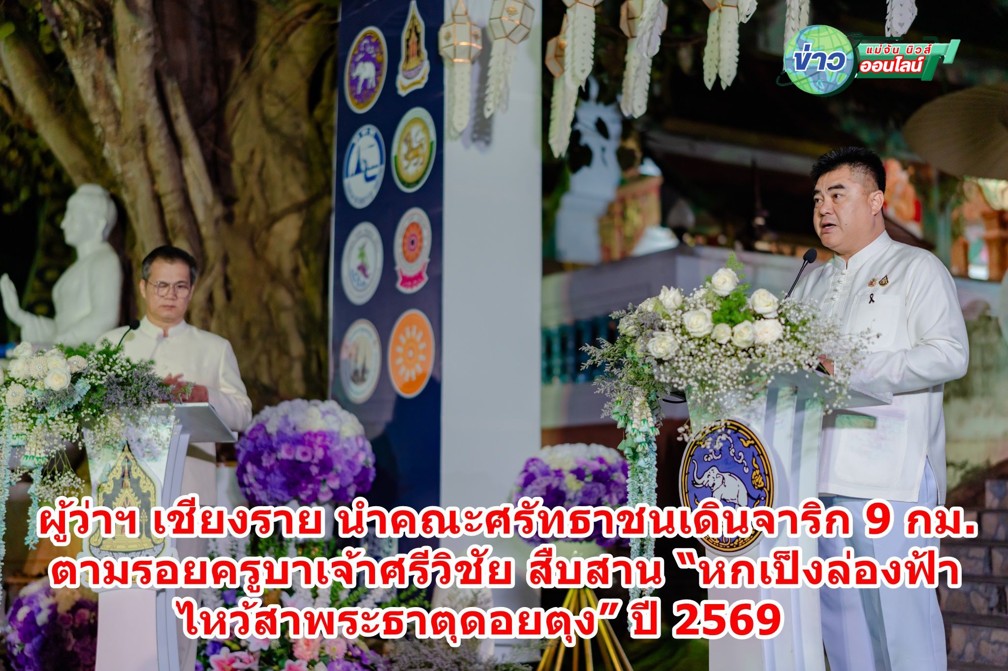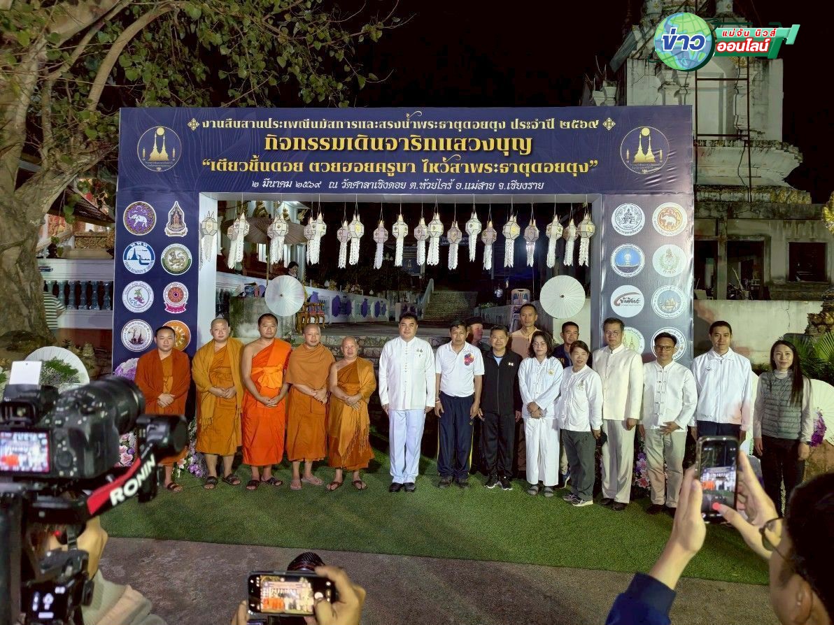 เช้าวันที่ 2 มีนาคม 2569 ที่วัดศาลาเชิงดอย ตำบลห้วยไคร้ อำเภอแม่สาย จังหวัดเชียงราย นายชูชีพ พงษ์ไชย ผู้ว่าราชการจังหวัดเชียงราย เป็นประธานปล่อยขบวนเดินจาริกแสวงบุญตามรอย ครูบาเจ้าศรีวิชัย ในงานประเพณีนมัสการและสรงน้ำ พระธาตุดอยตุง ประจำปี 2569 ภายใต้ชื่องาน “2008 ปี สืบมา หกเป็งล่องฟ้า ไหว้สาพระธาตุดอยตุง” ท่ามกลางคณะสงฆ์ หัวหน้าส่วนราชการ และพุทธศาสนิกชนจากเชียงรายและจังหวัดใกล้เคียงร่วมพิธีอย่างคับคั่ง
