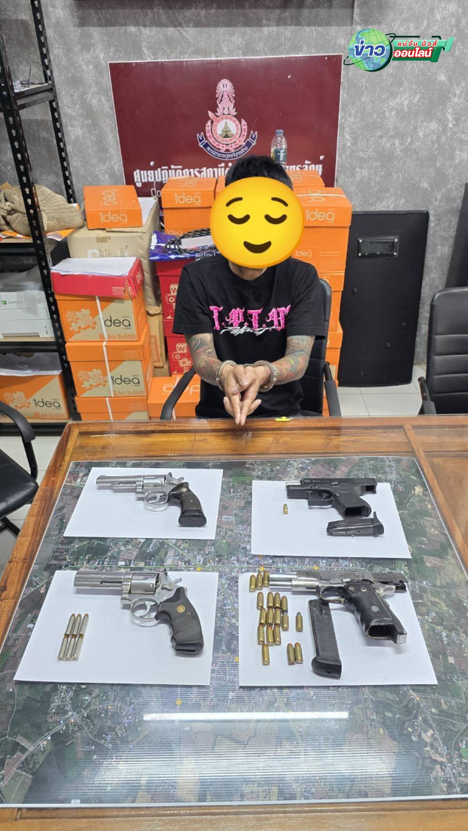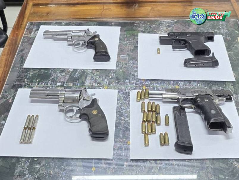 พร้อมของกลาง อาวุธปืนพกสั้น ชนิดลูกโม่ จำนวน 1 กระบอก อาวุธปืนพกสั้น ชนิดลูกโม่ จำนวน 1 กระบอก อาวุธปืนพกสั้น พร้อมแม็กกาซีน จำนวน 1 กระบอก อาวุธปืนพกสั้น พร้อมแม็กกาซีน (แบงค์กัน) จำนวน 1 กระบอก เครื่องกระสุนปืน ขนาด .45 มม. จำนวน 18 นัด เครื่องกระสุนปืน ขนาด .357 มม. จำนวน 6 นัด เครื่องกระสุนปืน ขนาด .380 มม. จำนวน 1 นัด และหนังสือสัญญากู้เงินตามกฎหมายใหม่ จำนวน 1 ฉบับ พบซุกซ่อนอยู่ในรถยนต์กระบะ อีซูซุ สีขาว คันหมายเลข ทะเบียน บห 8012 ศรีสะเกษ