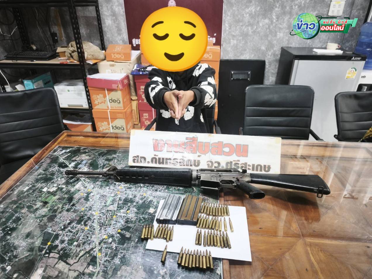 จากนั้นได้จับกุมตัว นายเอ (นามสมมุติ) อายุ 16 ปี ชาว ต.หนองหญ้าลาด อ.กันทรลักษ์ จ.ศรีสะเกษ พร้อมของกลาง อาวุธปืนเล็กยาว (M 16) จำนวน 1 กระบอก เครื่องกระสุนปืนขนาด 5.56 มม. จำนวน 50 นัด ซองกระสุนปืนเล็กยาว (M 16) จำนวน 2 แม็ก โดยแจ้งข้อกล่าวหาว่า “มีอาวุธปืนและเครื่องกระสุนปืนที่นายทะเบียนไม่สามารถออกในอนุญาตไว้ในครอบครองให้ได้”