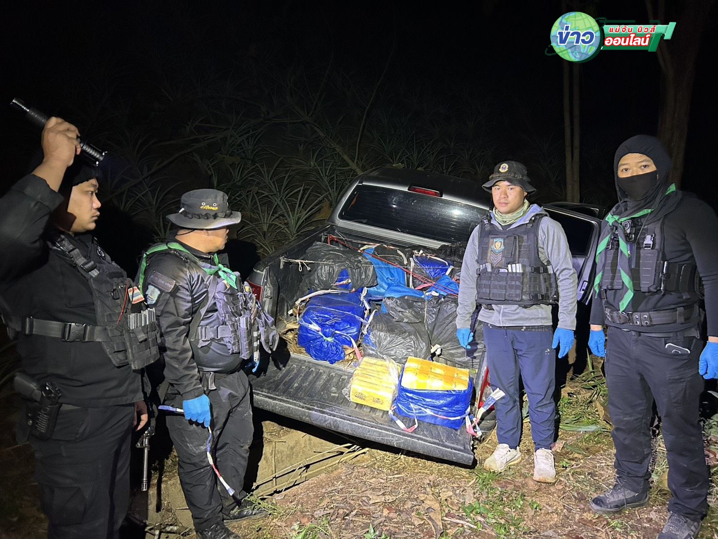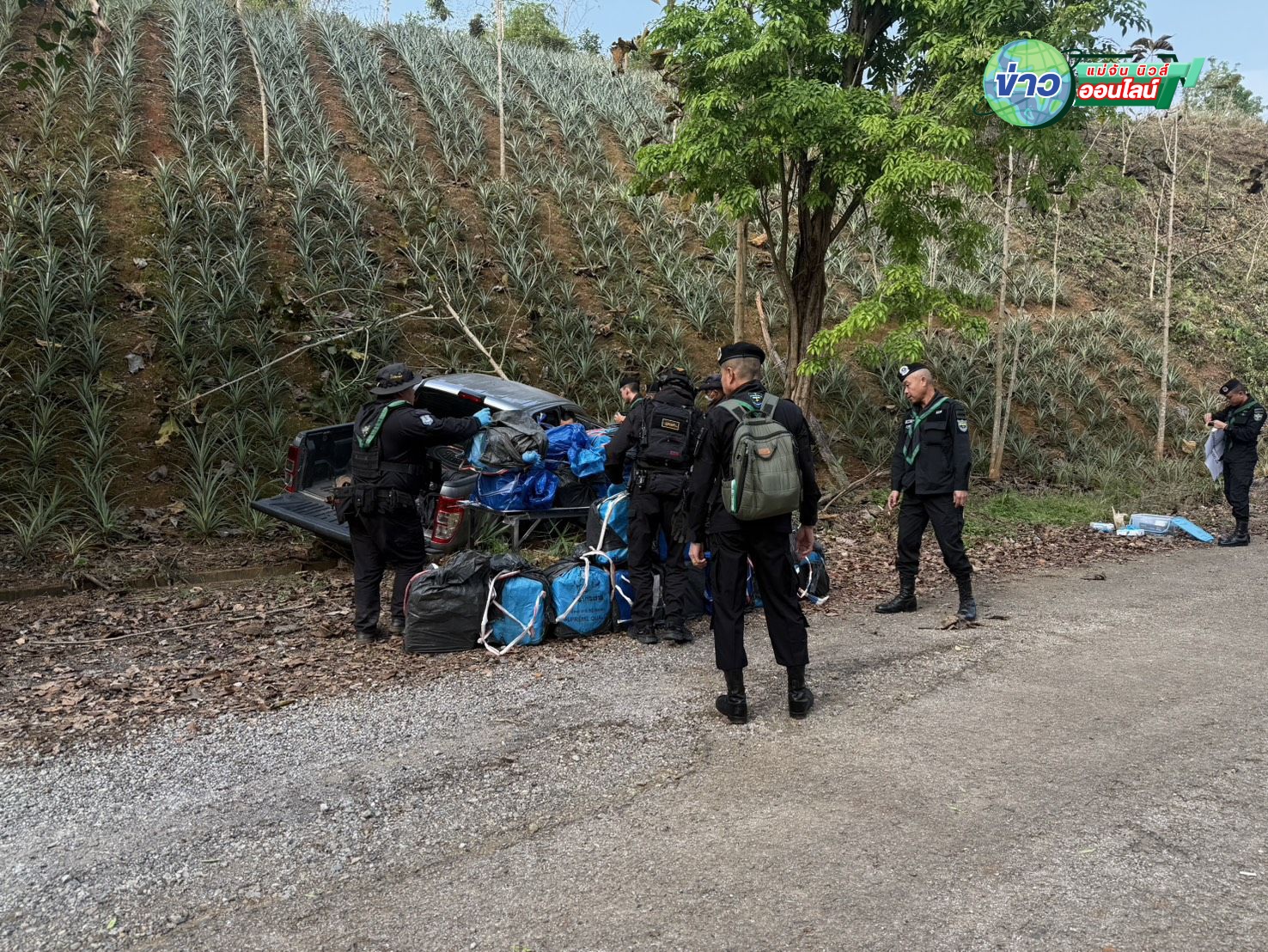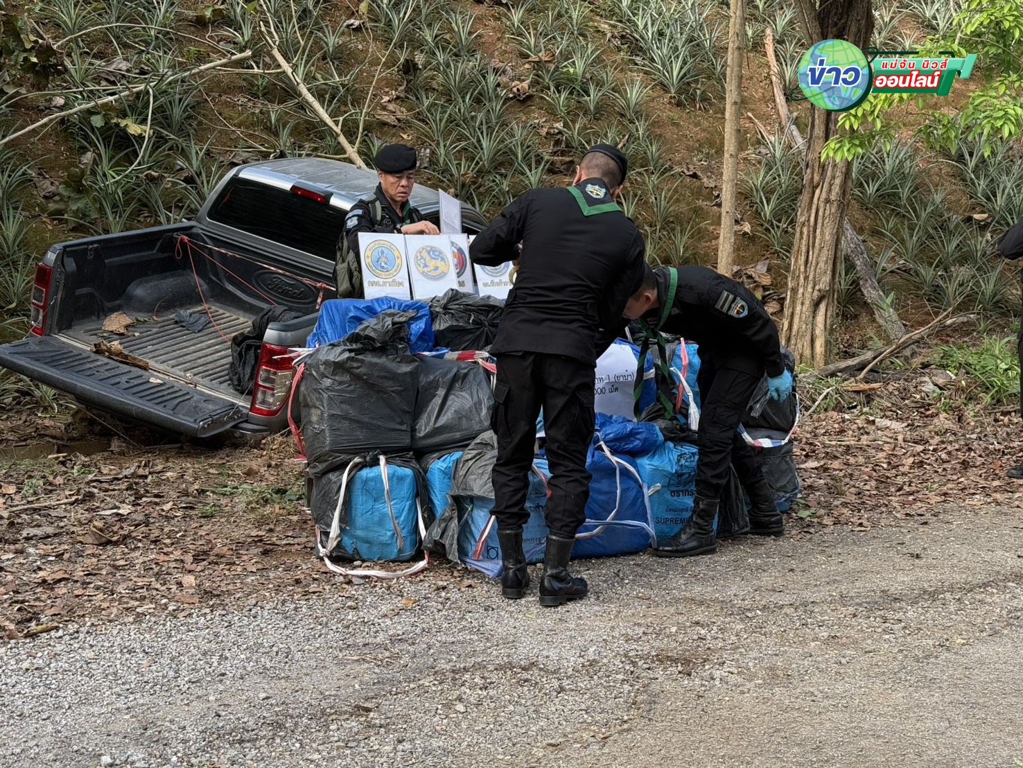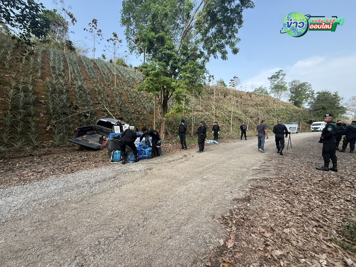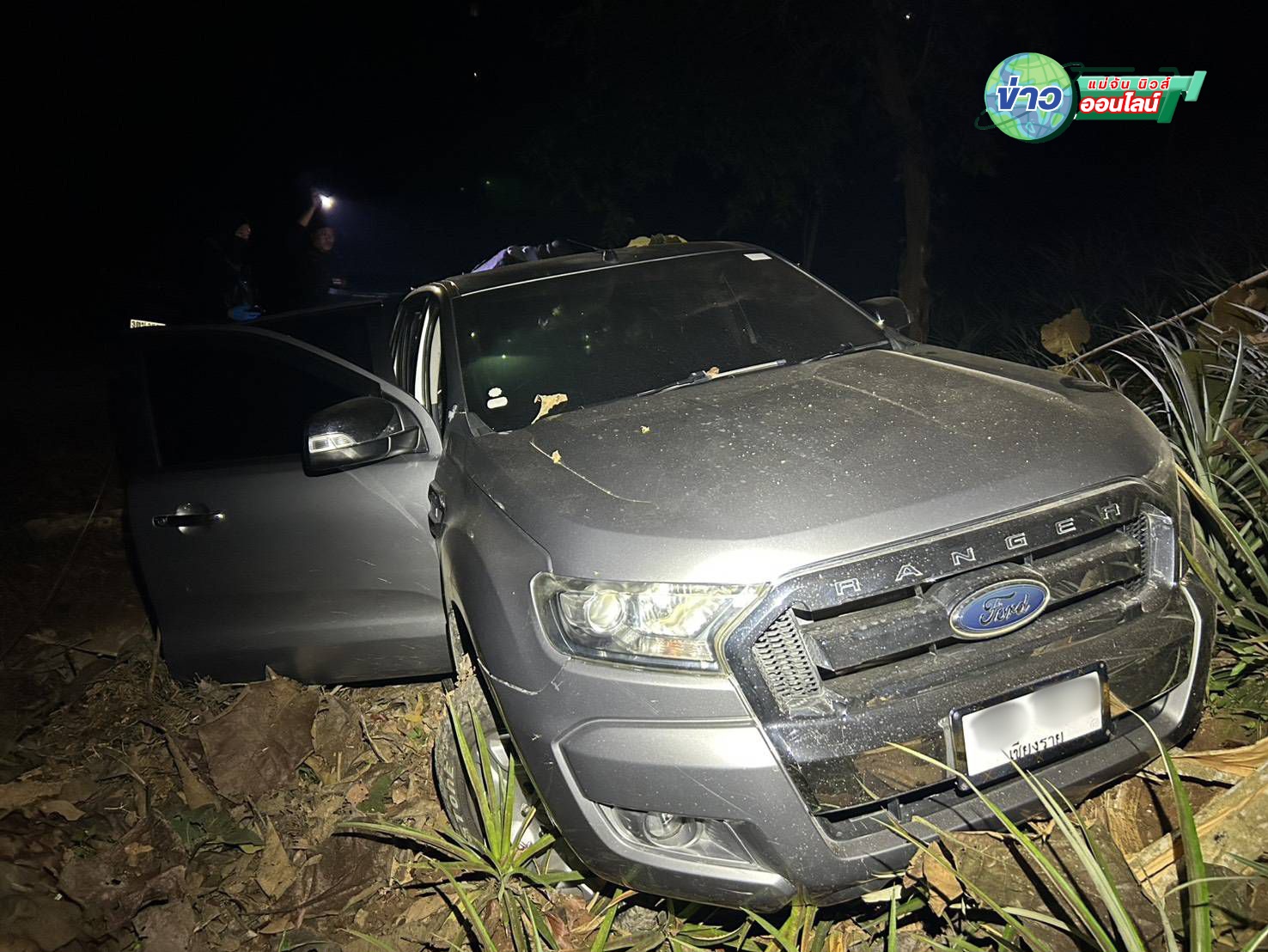 จากการตรวจสอบพบรถยนต์กระบะ 4 ประตู ยี่ห้อฟอร์ด สีบรอนซ์เงิน ทะเบียนจังหวัดเชียงราย เสียหลักตกลงไปในร่องระบายน้ำ บริเวณสวนสับปะรด แต่ไม่พบตัวคนขับ คาดว่าหลบหนีไปในความมืด