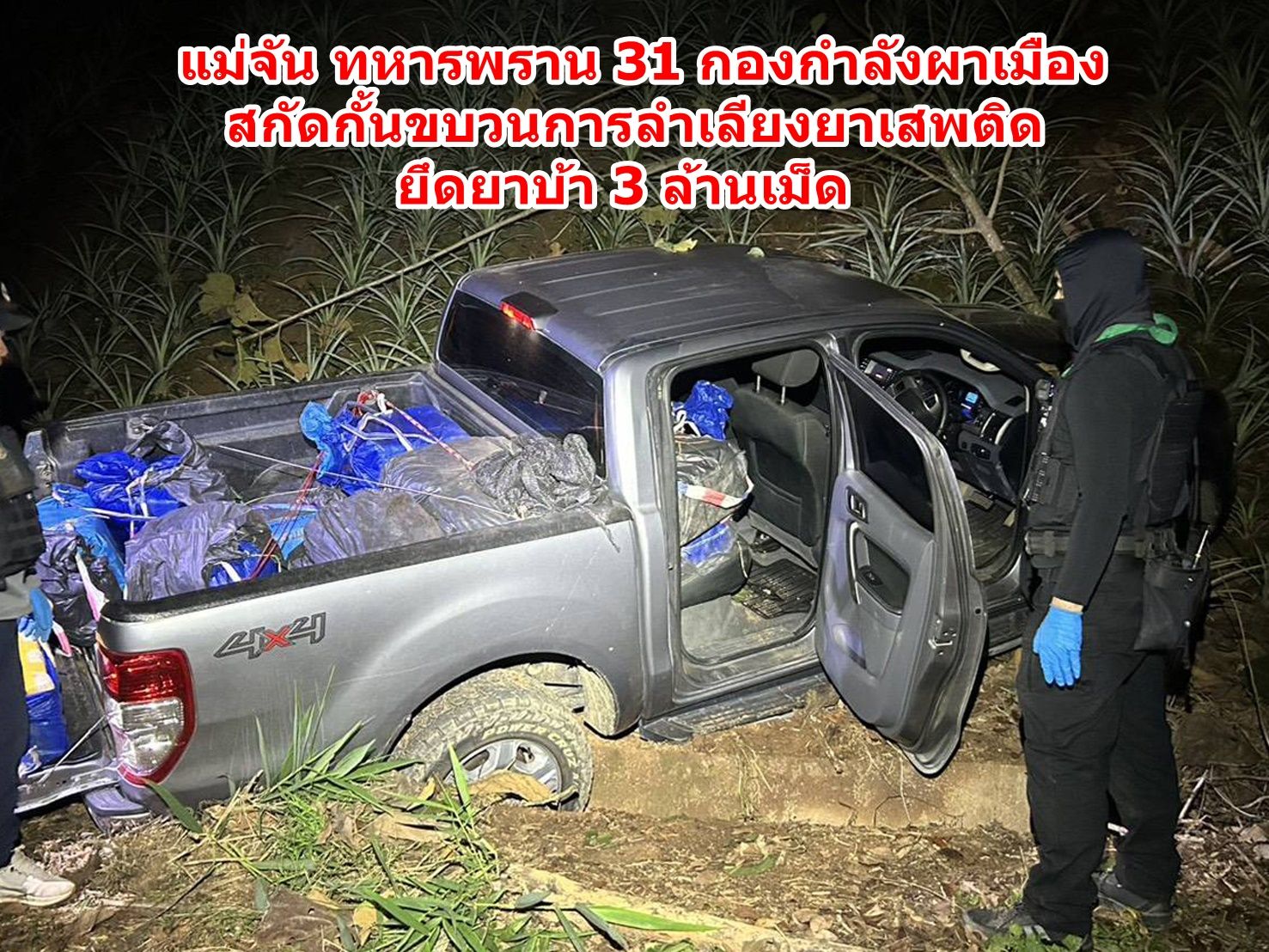เชียงราย – ทหารพราน 31 ไล่ล่ารถต้องสงสัย ยึดยาบ้า 3 ล้านเม็ด คนร้ายทิ้งรถหนีในสวนสับปะรดแม่จัน