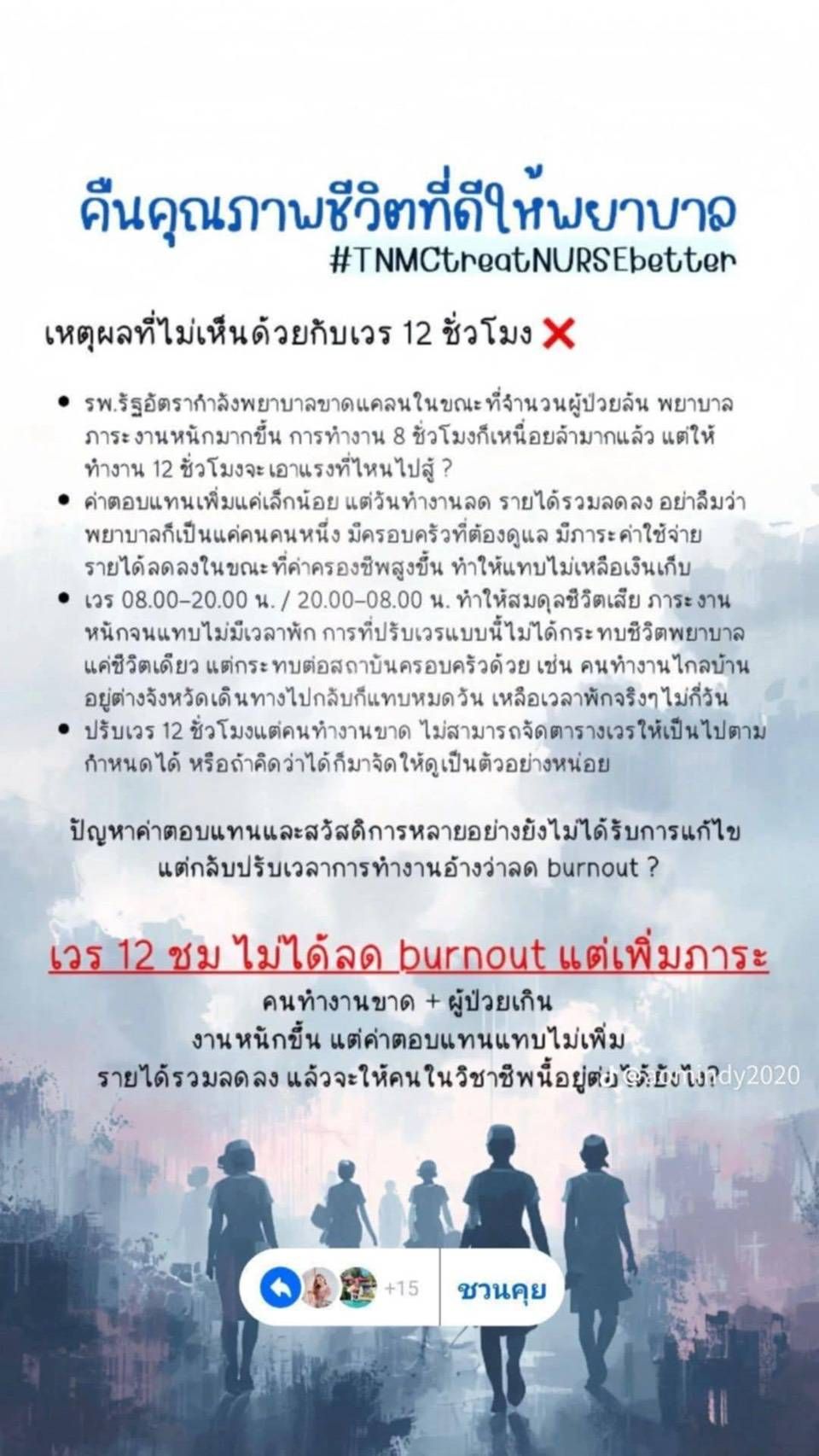 นอกจากนี้ยังระบุว่า ก่อนประกาศนโยบายดังกล่าว ผู้บริหารไม่ได้สอบถามความคิดเห็นจากบุคลากรอย่างทั่วถึง และมีการแจ้งกำหนดการจัดเวรแบบกะทันหัน โดยเตรียมเริ่มใช้ระบบเข้าเวร 12 ชั่วโมงตั้งแต่เดือน เมษายน 2569 เป็นต้นไป อีกทั้งค่าตอบแทนที่ได้รับยังถูกมองว่าไม่สอดคล้องกับภาระงานที่เพิ่มขึ้น