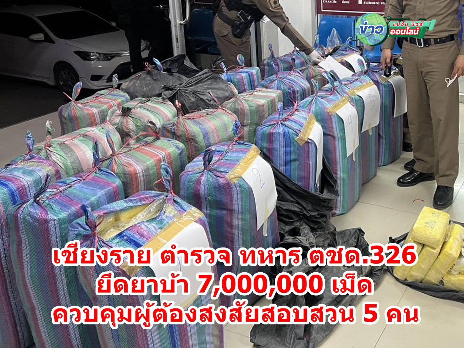 เจ้าหน้าที่สนธิกำลังสามฝ่ายสกัดจับขบวนการค้ายาเสพติดข้ามชาติ ยึดยาบ้าล็อตใหญ่ 7 ล้านเม็ด ซุกรถเอนกประสงค์ซิ่งหนีจุดสกัดเลียบน้ำโขงอำเภอเชียงของ รวบตัวผู้ต้องสงสัยได้ 5 ราย เร่งขยายผลล่าตัวคนขับที่ยังหลบหนี