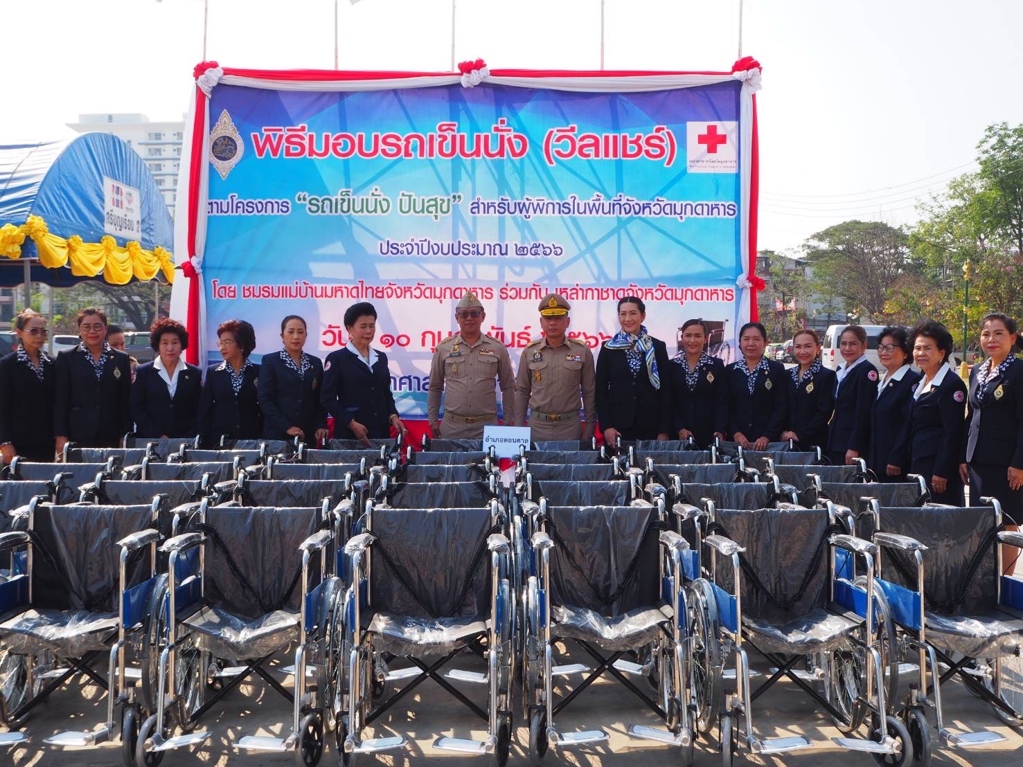 ในโอกาสนี้นายวรญาณ บุญณราช ผู้ว่าราชการจังหวัดมุกดาหาร และนางอัญชลี กัลมาพิจิตร บุญณราช ประธานชมรมแม่บ้านมหาดไทยจังหวัดมุกดาหาร และนายกเหล่ากาชาดจังหวัดมุกดาหาร เป็นตัวแทนส่งมอบรถเข็นวีลแชร์ ในโครงการ “รถเข็นนั่ง ปันสุข” สำหรับผู้พิการในพื้นที่จังหวัดมุกดาหาร ประจำปีงบประมาณ 2566 ให้แก่อำเภอทุกอำเภอนำไปมอบให้กลุ่มเป้าหมายที่ได้สำรวจไว้แล้ว อำเภอละ 10 ราย รวมทั้งสิ้น 70 ราย