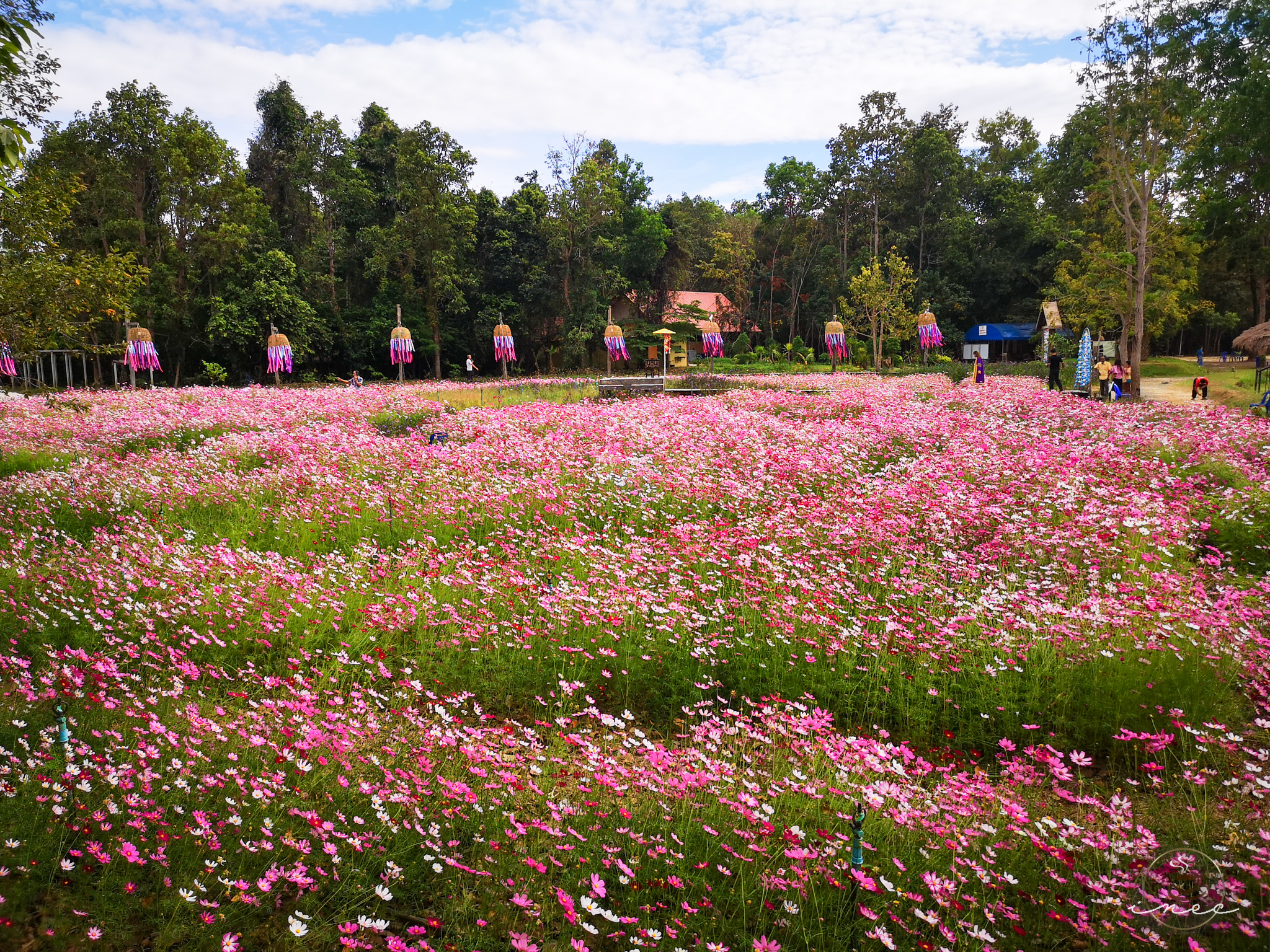 เมื่อวันที่ 11 ก.พ.2566 ผู้สื่อข่าวรายงานว่า ที่วัดป่าพิมลมังคลาราม บ้านโนนแดงโนนม่วง ต.ทุ่งไชย อ.อุทุมพรพิสัย จ.ศรีสะเกษ ซึ่งเป็นวัดที่ พระศรีญาณวิเทศ (พิมล ญาณวิมโล) เจ้าอาวาสวัดปากน้ำมิชิแกน เมืองสเตอริงไฮด์ รัฐมิชิแกน ประเทศสหรัฐอเมริกา และเจ้าอาวาสวัดป่าพิมลมังคลาราม ได้นำคณะสงฆ์ร่วมกับคณะกรรมการวัดและชาวบ้านได้ร่วมกันตกแต่งภูมิทัศน์รอบบริเวณวัดอย่างสวยงามตระการตา โดยมีการปลูกต้นคอสมอสกว่า 2 ล้านต้น ที่กำลังออกดอกอย่างสวยงามบานสะพรั่งเป็นบริเวณกว้าง ภายในบริเวณวัดแห่งนี้ มีการทำสะพานแขวนเพื่อให้นักท่องเที่ยวเดินลงไปชมความสวยงามบรรยากาศตามธรรมชาติที่ริมฝั่งห้วยสำราญ และทำสะพานไม้ทอดยาวผ่านทุ่งคอสมอสเพื่อให้นักท่องเที่ยวได้ชมและสัมผัสความสวยงามของดอกคอสมอส ซึ่งนักท่องเที่ยวได้พากันเซลฟี่กับดอกคอสมอส และพากันเดินไปตามสะพานไม้ที่ล้อมรอบทุ่งคอสมอส เพื่อชื่นชมความสวยงาม ส่วนบริเวณด้านหลังศาลาวัดได้มีการวาดภาพซุปเปอร์ฮีโร่ต่าง ๆ เอาไว้ เช่น กัปตันอเมริกา สไปเดอร์แมน เอาไว้ให้เด็กและนักท่องเที่ยวได้ชม และมีการทำสะพานแขวนให้นักท่องเที่ยวเดินข้ามไปยังหนองหิน ซึ่งเป็นศาลปู่ตาเก่าแก่ รวมทั้งมีการนำเอาจักรยานน้ำที่มีรูปแบบที่สวยงามมาไว้ให้นักท่องเที่ยวได้ปั่นเล่นในหนองหิน พร้อมทั้งทำน้ำตกจำลองมีปลาสวยงามอยู่ในสระน้ำจำนวนมาก หลังจากที่เดินเที่ยวชมความสวยงามรอบบริเวณวัดแล้ว จะมีร้านกาแฟที่ตกแต่งสถานที่อย่างสวยงาม เพื่อให้บริการนักท่องเที่ยวรวมทั้งผู้ที่มาปฏิบัติธรรมที่วัดได้ดื่มกาแฟรสชาติอร่อยเข้มข้นแก้กระหายในราคาที่ย่อมเยาอีกด้วย