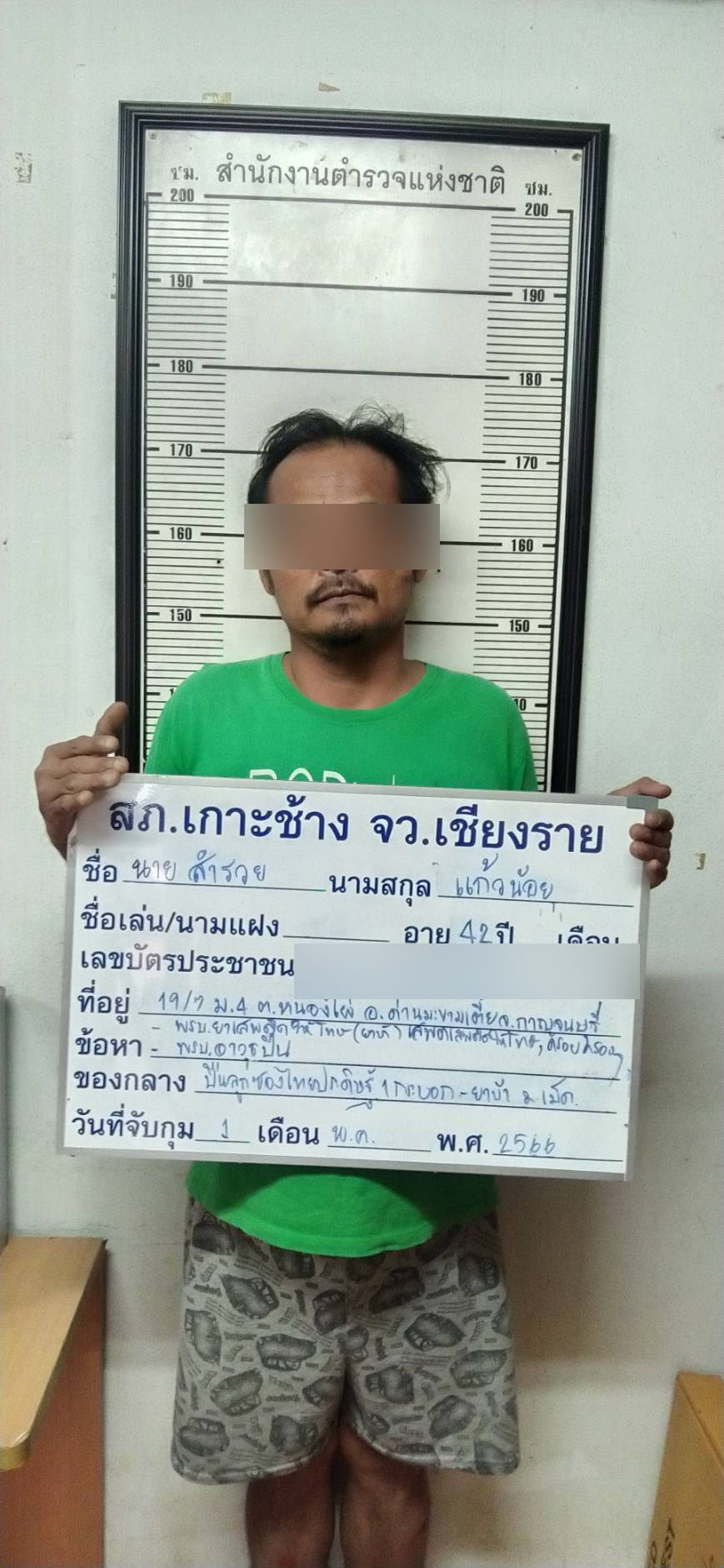 ซึ่งสามีของตนที่มีอาการคลุ้มคลั่งพูดจาวกวน ได้แอบซ่อนตัวอยู่ในห้องนอน ทางเจ้าที่จึงได้เข้าเกลี้ยกล่อมนายสำรวยฯ เพื่อให้สงบสติอารมณ์ แล้วยินยอมเปิดประตูให้เจ้าหน้าที่เข้าไปตรวจสอบบริเวณในห้องและรอบๆบ้าน หลังดังกล่าว ต่อมาหน้าเจ้าหน้าที่ได้ตรวจพบยาบ้าจำนวน 2 เม็ด ชนิดกลมแบน สีแดง ประทับตรา WY ซุกซ่อนอยู่ในกระเป๋าสะพายสีน้ำตาล และอาวุธปืนสั้นไทยประดิษฐ์ ขนาด 12 จำนวน 1 กระบอก ซุกซ่อนห่ออยู่ในผ้าสีขาวในถุงเก็บเสื้อผ้า ซึ่งนายนายสำรวย มีอาการกระวนกระวาย และรับว่าเสพยาบ้ามาก่อนหน้านี้ ทางเจ้าหน้าที่จึงได้ส่งตัวอย่างปัสสาวะไปตรวจสารเสพติดที่ รพ.แม่สาย ได้ผลตรวจยืนยันของทางการแพทย์ พบสารเสพติดชนิดเมทแอมเฟตามีน อยู่ในร่างกายของผู้ต้องหา เจ้าหน้าที่ชุดจับกุมจึงได้แจ้งข้อกล่าวหาให้ทราบว่า มียาเสพติดให้โทษไว้เพื่อเสพ และมีอาวุธสั้นไทยประดิษฐ์ที่ไม่มีทะเบียนไว้ในครอบครองโดยไม่ได้รับอนุญาต พร้อมนำผู้ต้องหา และของกลางส่งพนักงานสอบสวน สภ.เกาะช้างนำดำเนินคดี…