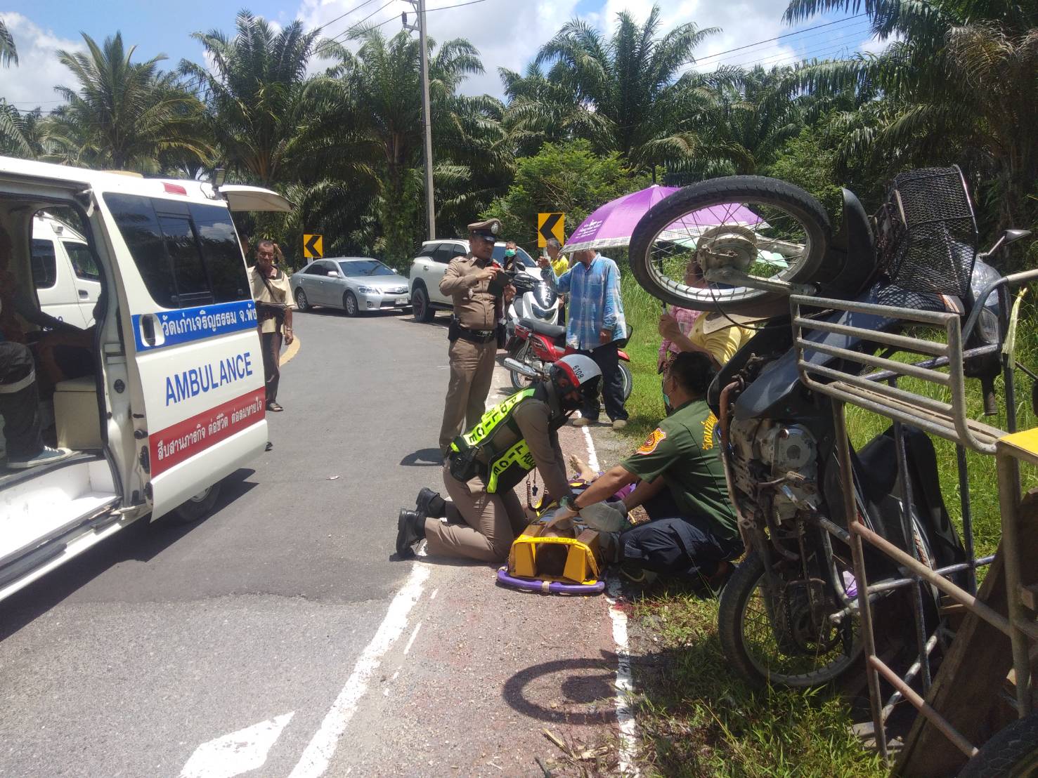 จักรยานยนต์พ่วงข้างเสียหลักตกลงข้างทางถนนไร้ฝุ่น