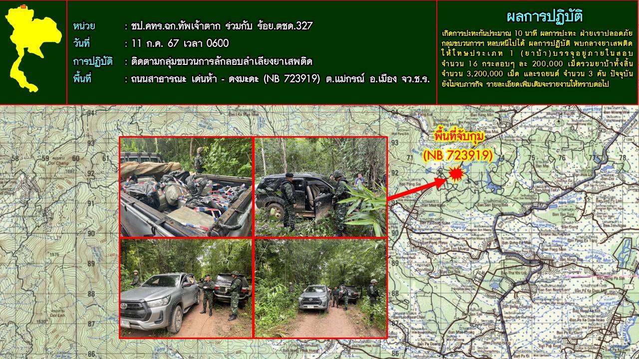 พล.อ. นฤทธิ์ ถาวรวงษ์ ผู้บัญชาการหน่วยบัญชาการสกัดกั้นและปราบปรามยาเสพติด สารตั้งต้นและเคมีภัณฑ์ ชายแดนภาคเหนือ หรือ นบ.ยส.35 เปิดเผยว่า เมื่อวันที่ 11 ก.ค.67 เวลา 06.00น. ตชด.ภาค 3 โดย ร้อย.ตชด.327 ร่วมกับ ฉก.ทัพเจ้าตาก ติดตามกลุ่มขบวนการลักลอบลำเลียงยาเสพติดจากแนวชายแดน อ.แม่ฟ้าหลวง จ.เชียงราย เข้ามาพักคอยในพื้นที่ตอนใน ตรวจพบรถยนต์ต้องสงสัย 3 คัน บริเวณ ถนนสาธารณะ เด่นห้า – ดงมะดะ ต.แม่กรณ์ อ.เมือง จ.เชียงราย