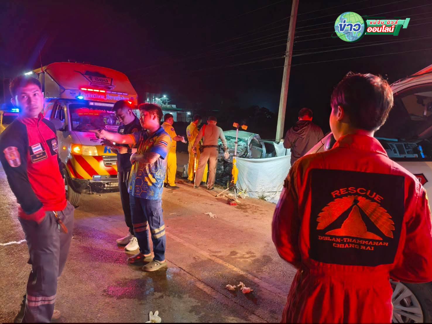เมื่อเวลา 20.40 น. วันที่ 9 ธ.ค. 68 ร.ต.ท.ธรรมราช อุ่นเรือน รอง สว.(สอบสวน) สภ.เมืองเชียงราย พนักงานสอบสวนเวร ได้รับแจ้งเหตุรถยนต์กระบะ 2 คัน ชนประสานงาอย่างรุนแรงบนถนนเชียงราย-เทิง พื้นที่บ้านร่องเบ้อ ม.9 ต.ห้วยสัก อ.เมืองเชียงราย จ.เชียงราย มีผู้บาดเจ็บและติดอยู่ภายในรถเป็นจำนวนมาก จึงรีบรุดไปตรวจสอบที่เกิดเหตุร่วมกับแพทย์เวร รพ.เชียงรายประชานุเคราะห์ รพ.เชียงรายราม สมาคมกู้ชีพธรรมนันท์ เชียงราย มูลนิธิสยามเชียงราย สมาคมศิริกรณ์เชียงรายบรรเทาสาธารณภัย มูลนิธิแสงธรรมสาธารณกุศลเชียงราย กู้ชีพเทศบาลตำบลห้วยสัก กู้ชีพเทศบาลตำบลดอยลาน ตำรวจประจำป้อมยามตำรวจตำบลห้วยสัก ทีมเฝ้าระวังและตอบโต้ภัยพิบัติจังหวัดเชียงราย และเจ้าหน้าที่จากแขวงการทางเชียงราย