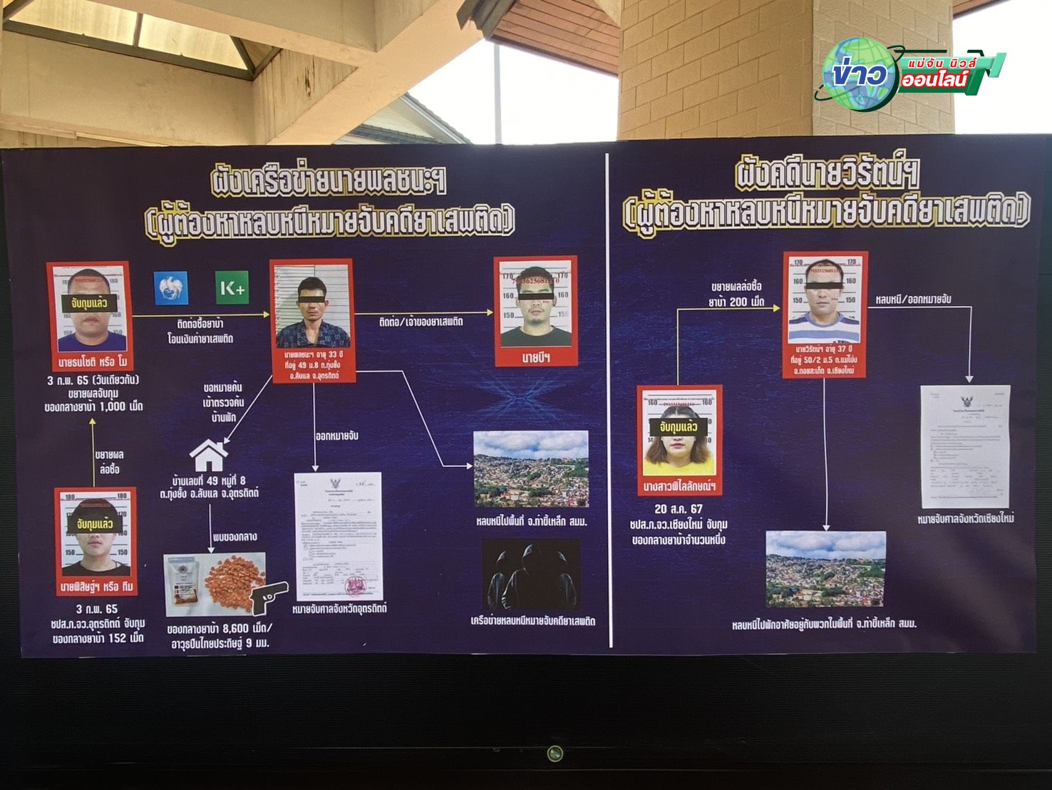 3.นายพลชนะ พงษ์ทอง อายุ 33 ปี สัญชาติไทย จ.อุตรดิตถ์ ผู้ต้องหาตามหมายจับศาลจังหวัดอุตรดิตถ์ ในความผิดฐาน“จำหน่ายโดยการมีไว้ในครอบครองเพื่อจำหน่ายซึ่งยาเสพติดให้โทษในประเภท 1 (เมทแอมเฟตามีนไฮโดรคลอไรด์) โดยไม่ได้รับอนุญาต อันเป็นการกระทำเพื่อการค้า อันเป็นการก่อให้เกิดการแพร่กระจายในกลุ่มของประชาชน กระทำโดยมีอาวุธ และเป็นการกระทำให้เกิดผลกระทบต่อความมั่นคงของรัฐหรือความปลอดภัยของประชาชนทั่วไป และมีอาวุธปืนและเครื่องกระสุนปืนไว้ในครอบครองโดยไม่ได้รับอนุญาต”นำส่ง สภ.ด่านแม่คำมัน