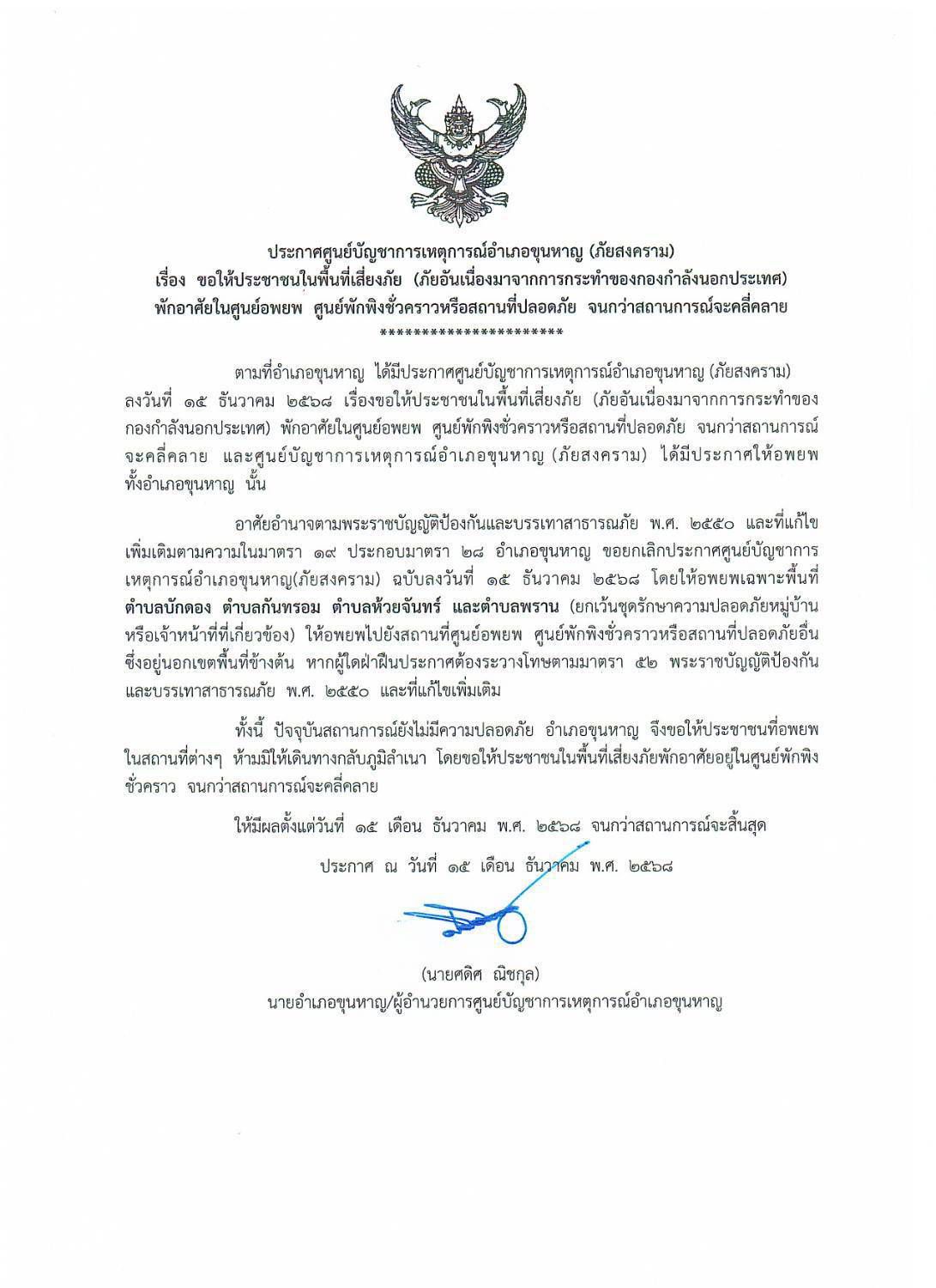 เมื่อวันที่ 15 ธ.ค. 2568 นายศดิศ ณิชกุล นายอำเภอขุนหาญ เปิดเผยว่า อ.ขุนหาญ ได้ออกประกาศในการบังคับใช้กฎหมาย ตาม พ.ร.บ.ป้องกันและบรรเทาสาธารณภัย พ.ศ. 2550 และที่แก้ไขเพิ่มเติม ตามความในมาตรา 19 ประกอบมาตรา 28 ให้อพยพพี่น้องประชาชนออกจากพื้นที่ 4 ตำบล ได้แก่ ต.บักดอง ต.กันทรอม ต.ห้วยจันทร์ และต.พราน ทั้งหมด 100 เปอร์เซ็น ไปยังศูนย์พักพิงชั่วคราว ที่ทางราชการจัดเตรียมไว้รองรับในพื้นที่อำเภอต่างๆ และห้ามประชาชนเดินทางกลับภูมิลำเนาในพื้นที่เสี่ยง เพื่อความปลอดภัย จนกว่าสถานการณ์จะคลี่คลาย หากฝ่าฝืนคำสั่งมีโทษจับ-ปรับ ตามกฎหมาย