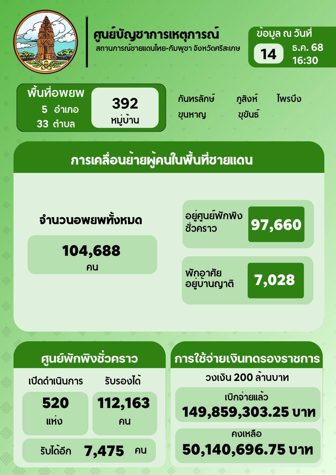 ด้าน นายอนุรัตน์ ธรรมประจำจิต ผวจ.ศรีสะเกษ เปิดเผยว่า ด้วยสถานการณ์การสู้รบตามชายแดนไทย-กัมพูชา เริ่มตั้งแต่เมื่อช่วงบ่ายของวันที่ 7 ธ.ค. ที่ผ่านมา