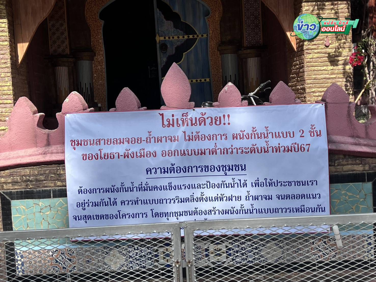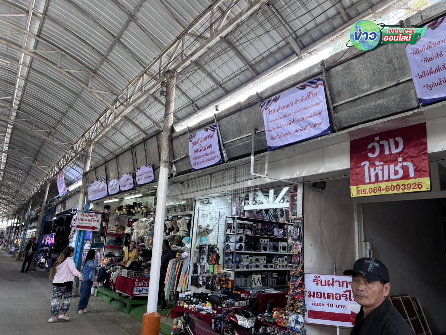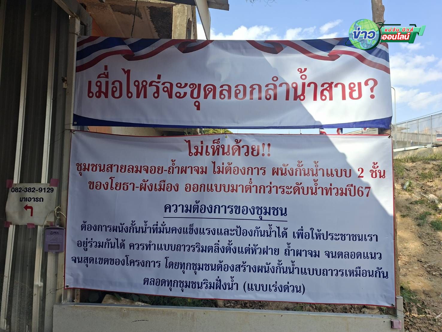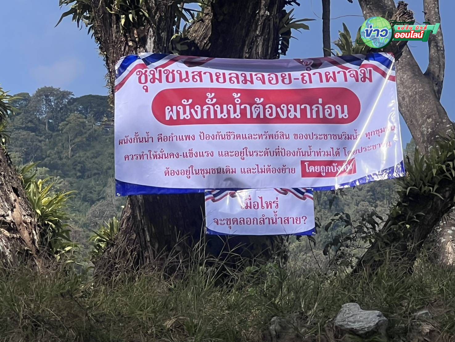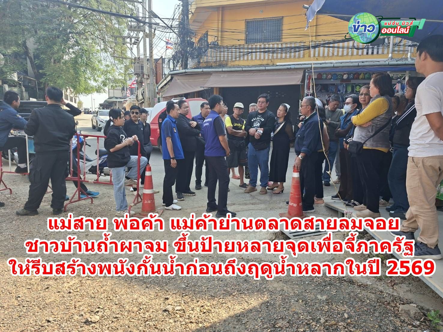 แม่สาย พ่อค้า แม่ค้าย่านตลาดสายลมจอย ชาวบ้านถ้ำผาจม ขึ้นป้ายหลายจุดเพื่อจี้ภาครัฐให้รีบสร้างพนังกั้นน้ำ ก่อนถึงฤดูน้ำหลากในปี 2569