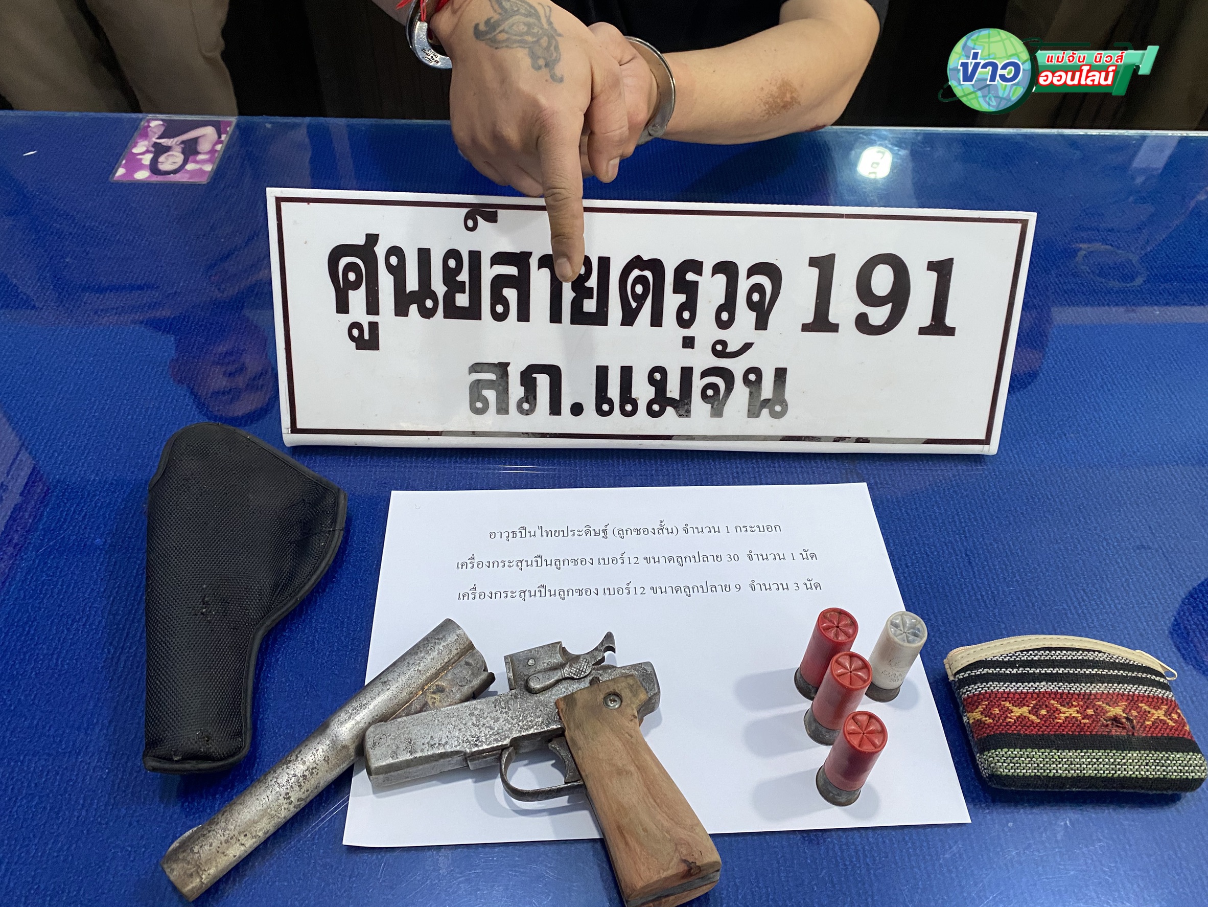 กระทั่งวันนี้ (22 ม.ค.69) เจ้าหน้าที่ตำรวจสายตรวจ 191 สภ.แม่จัน ตั้งจุดตรวจจุดสกัดในพื้นที่ พบรถจักรยานยนต์ต้องสงสัยขับขี่เข้าใกล้จุดตรวจ ก่อนจะเลี้ยวกลับพยายามหลบหนี เจ้าหน้าที่จึงติดตามและสามารถควบคุมตัวไว้ได้ ทราบชื่อคือ นายศรายุธ หรือ “เซิ่นแว่น” ผู้ต้องหาตามหมายจับคดีดังกล่าว ตรวจค้นพบ สนับมือ อาวุธปืนลูกซองสั้นแบบประดิษฐ์เอง เบอร์ 12 บรรจุกระสุนในรังเพลิง 1 นัด และกระสุนสำรองอีก 3 นัด พร้อมยิงใช้งาน