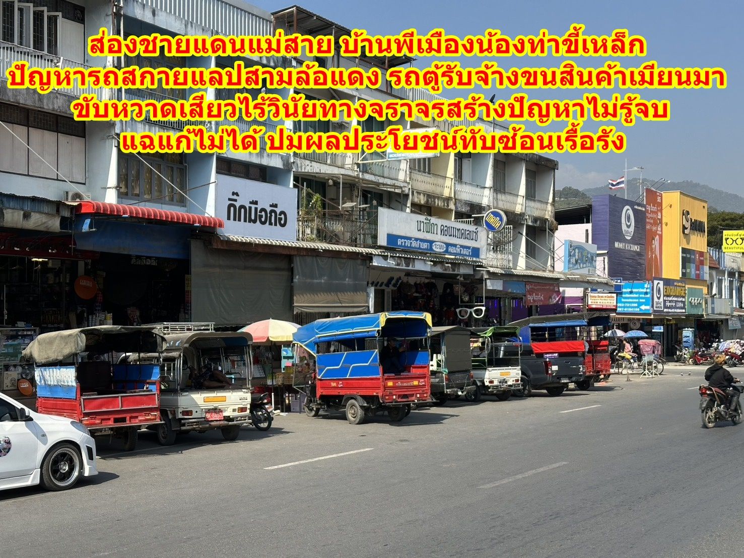 วิกฤตจราจรชายแดนแม่สาย รถสกายแลปสามล้อแดงเมียนมาจอดแช่นานหลายชั่วโมง ชาวบ้าน-นักท่องเที่ยวเบื่อหน่าย รถตู้รับจ้างขนสินค้าขับเร็วหวาดเสียวปาดซ้ายปาดขวาไร้วินัยสร้างปัญหาไม่รู้จบ แฉแก้ไม่ได้ ปมผลประโยชน์ทับซ้อนเรื้อรังมานาน สื่อระดับประเทศเขาลงแฉ กันทั้งบาง เมืองชายแดนแม่สายเชียงราย ปัญหาการจราจรติดขัด ย่านบริเวณตั้งแต่แยกไฟแดงกวงเม้ง หน้าตลาดนายบุญยืน จรดถึงบริเวณด่านพรมแดนแม่สายแห่งที่ 1