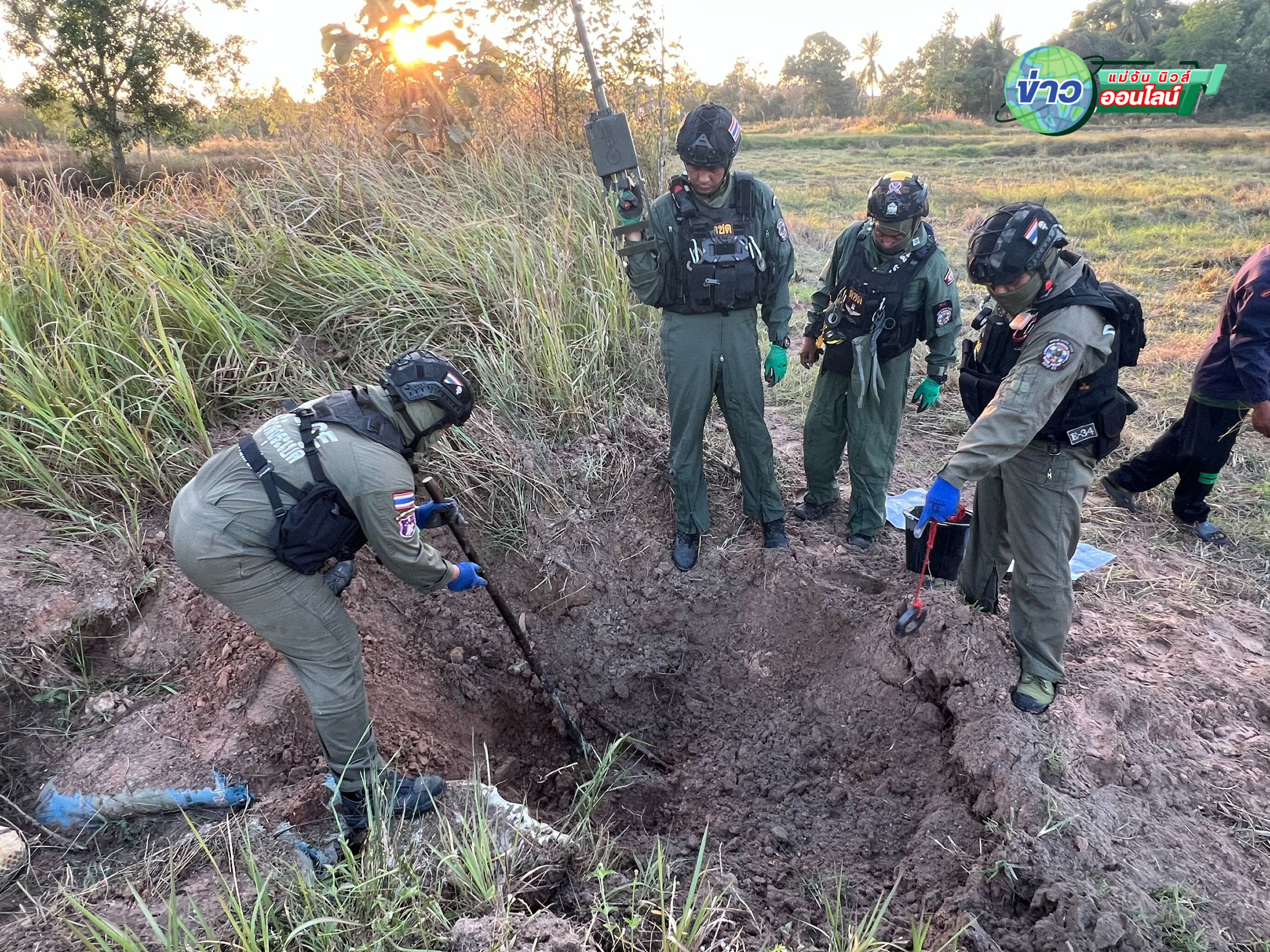 เมื่อวันที่ 31 ม.ค.69 ที่บ้านโนนสว่าง หมู่ 5 ต.เสาธงชัย อ.กันทรลักษ์ จ.ศรีสะเกษ ร.ต.อ.ธีรภัทร นามมั่น หัวหน้าชุด เก็บกู้และทำลายวัตถุระเบิด (EOD กก.ตชด.22) ได้นำเจ้าหน้าที่ EOD จังหวัดศรีสะเกษ เร่งเก็บกู้เเละทำลายวัตถุระเบิดตามแนวชายแดนเขาพระวิหาร หลังได้รับแจ้งจากชาวบ้านว่าพบระเบิดตกอยู่ในทุ่งนาบ้านโนนสว่าง หมู่ 5 ต.เสาธงชัย