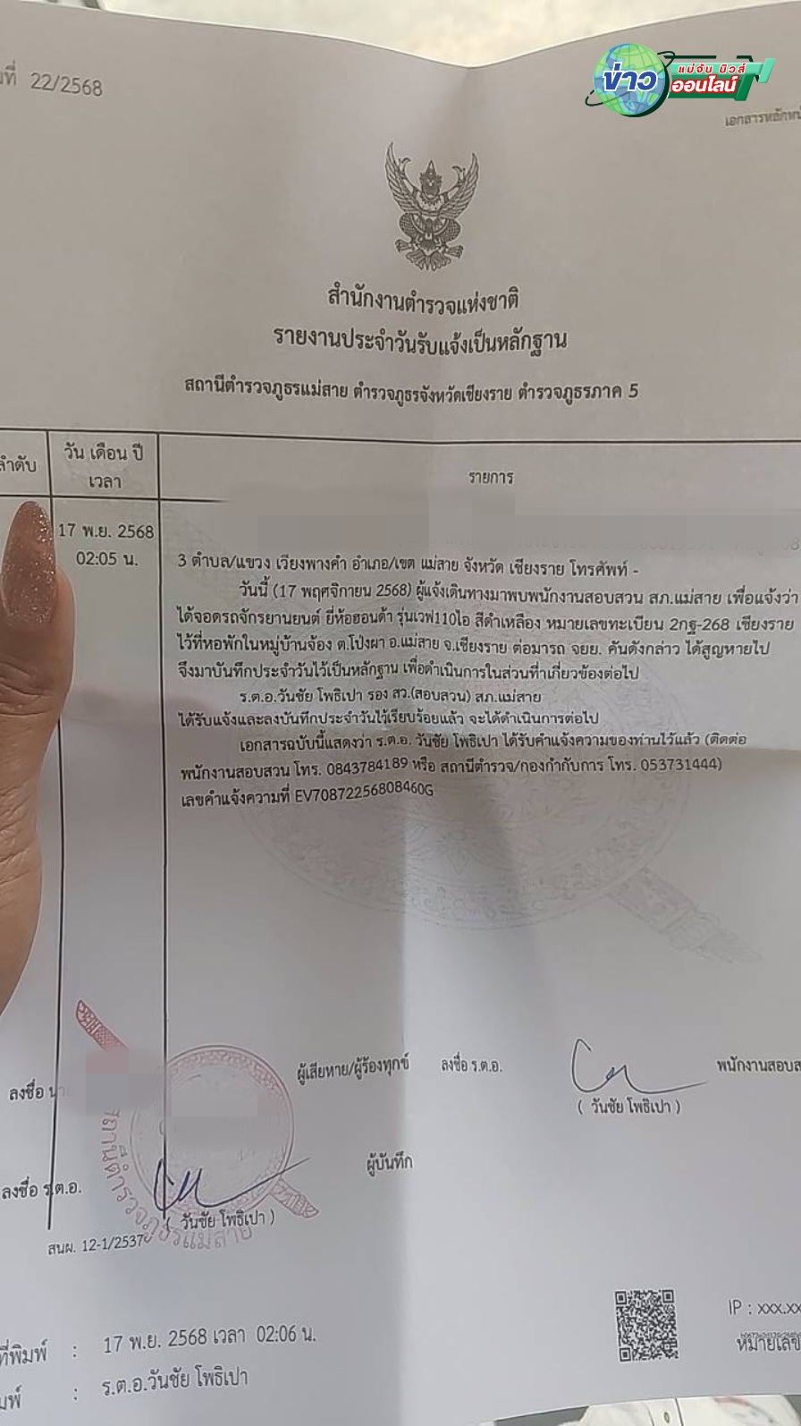โดยก่อนหน้านี้ นส. ยามิน ได้เข้าแจ้งความไว้กับ ร.ต.อ.วันขัย โพธิเปา รองสารวัตร (สอบสวน) สภ.แม่สาย ตั้งแต่วันที่ 17 พฤศจิกายน 2568 เวลาประมาณ 02.05 น. หลังพบว่ารถจักรยานยนต์ของตนได้หายไปจากหอพักในพื้นที่ดังกล่าว
