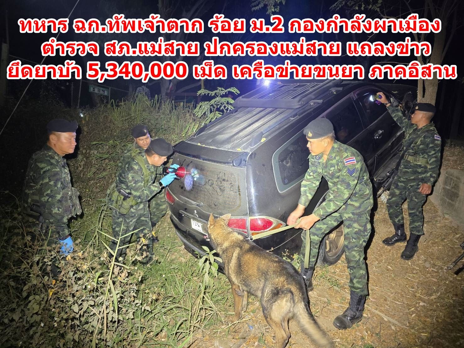 เมื่อเวลา 01.00 น. วันที่ 9 กุมภาพันธ์ 2569 เจ้าหน้าที่ทหาร ร้อย.ม.3 ฉก.ทัพเจ้าตาก กองกำลังผาเมือง สนธิกำลังร่วมกับชุดปฏิบัติการ ร้อย.คทร. และชุดปฏิบัติการสุนัขทหารที่ 10 กองกำลังผาเมือง ตั้งจุดตรวจจุดสกัดแบบไม่ประจำที่ เพื่อป้องกันและสกัดกั้นการลักลอบลำเลียงยาเสพติด ตาม พ.ร.บ.ยาเสพติด พ.ศ.2564 บริเวณถนนพื้นที่หมู่เหมืองแดงใต้ หมู่ 1 ต.แม่สาย อ.แม่สาย จ.เชียงราย ซึ่งเป็นพื้นที่แนวชายแดนไทย-เมียนมา
