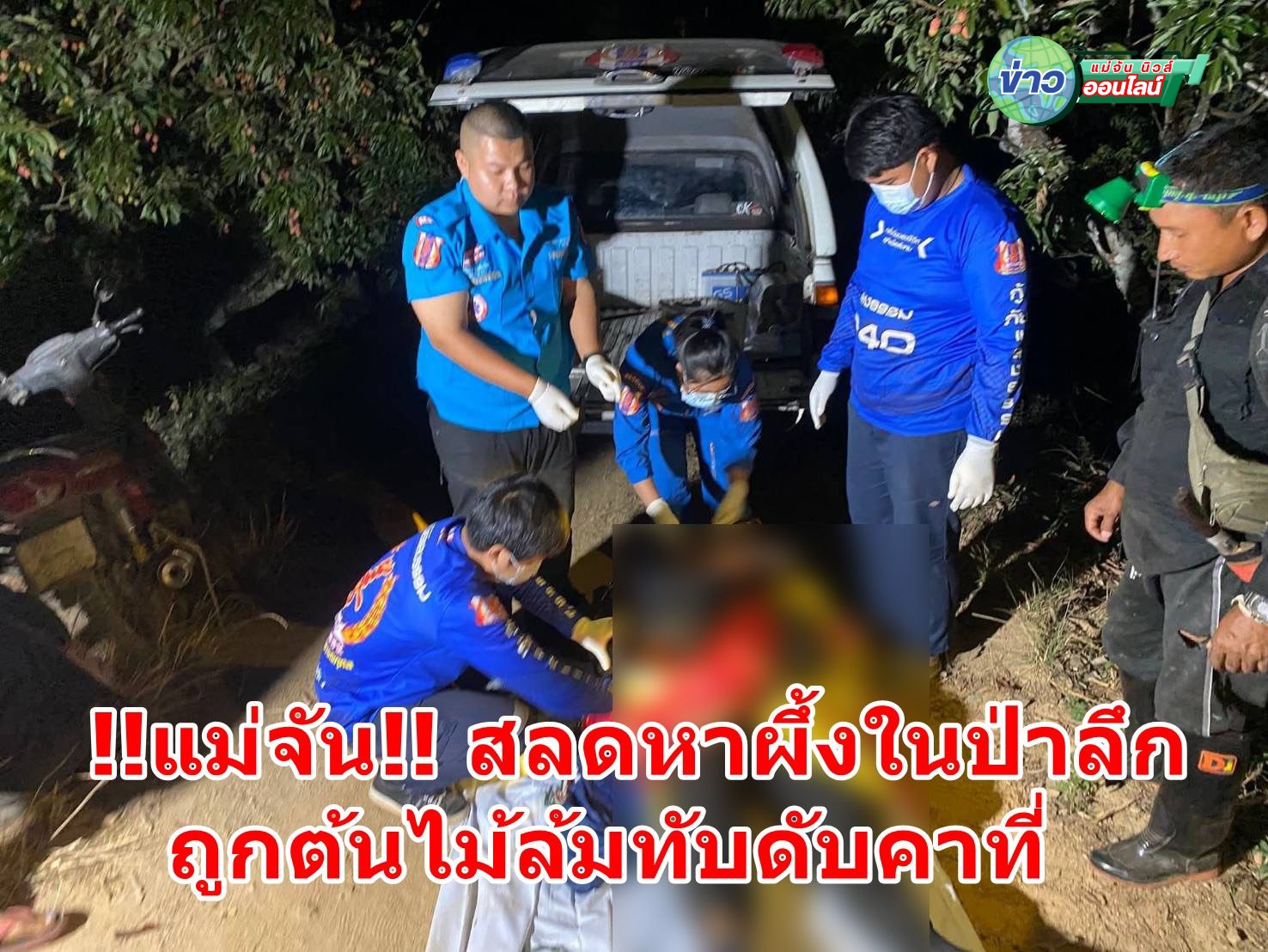 โดยจุดดังกล่าวรถยนต์ไม่สามารถเข้าถึงได้ทางเจ้าหน้าที่ตำรวจ สภ.แม่จัน และหน่วยงานที่เกี่ยวข้องจึงขอความร่วมมือจากมูลนิธิฯ ในการนำร่างดังกล่าวออกจากป่าลึกประมาณ 3-4 กิโลเมตรและรถยนต์ไม่สามาถเข้าไปถึงได้ ทางอาสากู้ภัยมูลนิธิฯ จึงได้จัดเจ้าหน้าที่ทำการเดินเท้าเข้าไปในป่าจนถึงจุดเกิดเหตุก็ได้พบร่างของชายจำนวน 1 คน อายุประมาณ 53 ปี สภาพพึ่งถูกต้นไม้ล้มทับร่างจนเสียชีวิตคาที่กลางป่า